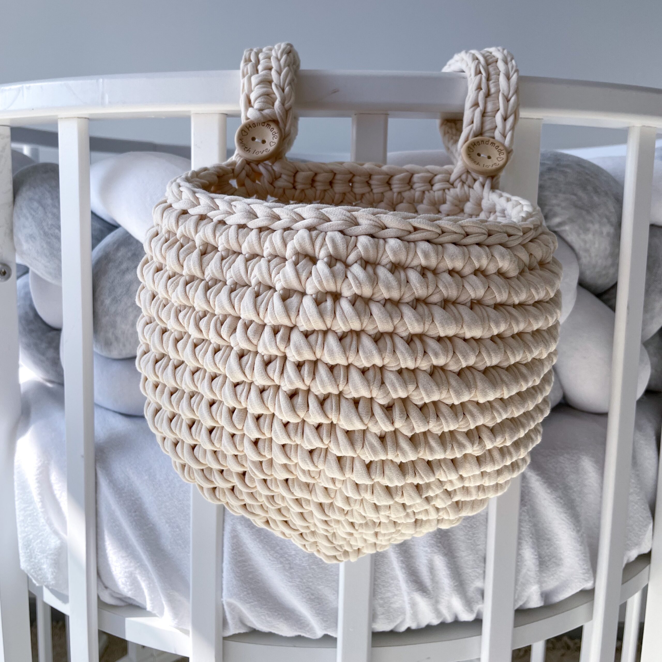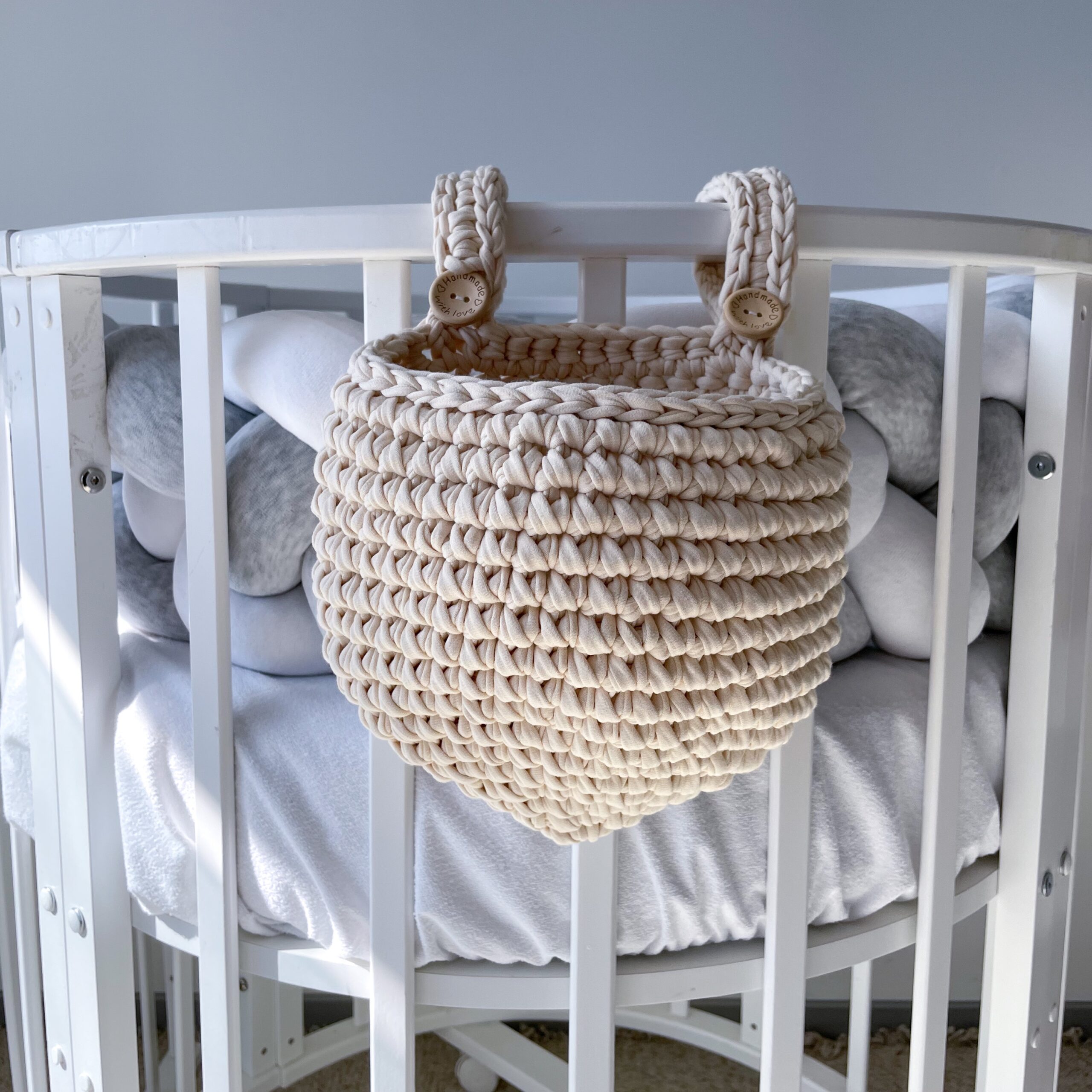 Практичная корзинка, которая всегда под рукой — именно там, где это нужно маме. Корзинка крепится к кроватке с помощью удобных петель на пуговицах и идеально подходит для хранения подгузников, сосок, кремов и других важных мелочей. Всё необходимое всегда рядом — без лишних движений и поиска. Изделие связано из плотной трикотажной пряжи, хорошо держит форму и выглядит аккуратно даже при ежедневном использовании. Нежный оттенок легко впишется в интерьер детской и красиво дополнит комплект постельных принадлежностей. Преимущества: Удобное хранение всего необходимого под рукой Крепление на кроватку — легко снять и повесить Хорошо держит форму Плотная и износостойкая вязка Безопасно для использования рядом с малышом Стильный элемент декора детской Характеристики: Материал: трикотажная пряжа Крепление: петли на пуговицах Ручная работа Уход: Ручная стирка или деликатный режим Не выкручивать Сушить в расправленном виде При необходимости придать форму после стирки