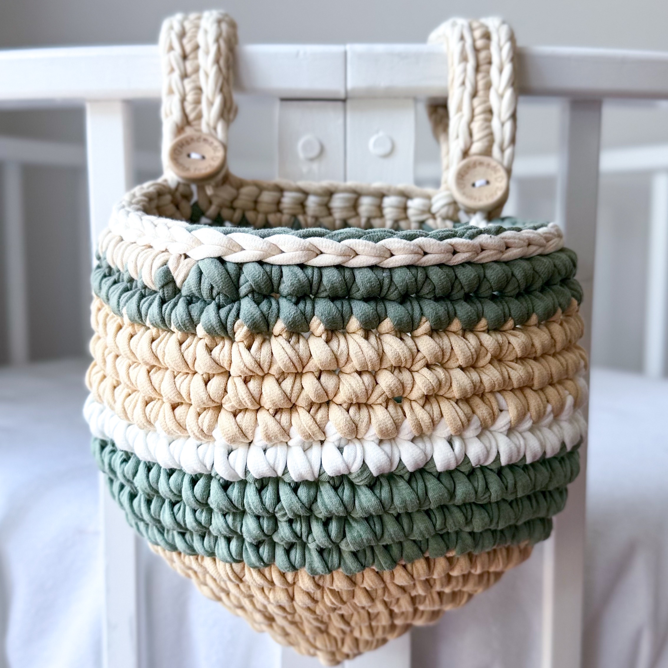 Практичная корзинка, которая всегда под рукой — именно там, где это нужно маме. Корзинка крепится к кроватке с помощью удобных петель на пуговицах и идеально подходит для хранения подгузников, сосок, кремов и других важных мелочей. Всё необходимое всегда рядом — без лишних движений и поиска. Изделие связано из плотной трикотажной пряжи, хорошо держит форму и выглядит аккуратно даже при ежедневном использовании. Нежный оттенок легко впишется в интерьер детской и красиво дополнит комплект постельных принадлежностей. Преимущества: Удобное хранение всего необходимого под рукой Крепление на кроватку — легко снять и повесить Хорошо держит форму Плотная и износостойкая вязка Безопасно для использования рядом с малышом Стильный элемент декора детской Характеристики: Материал: трикотажная пряжа Крепление: петли на пуговицах Цвет: нежный лаймовый Ручная работа Уход: Ручная стирка или деликатный режим Не выкручивать Сушить в расправленном виде При необходимости придать форму после стирки