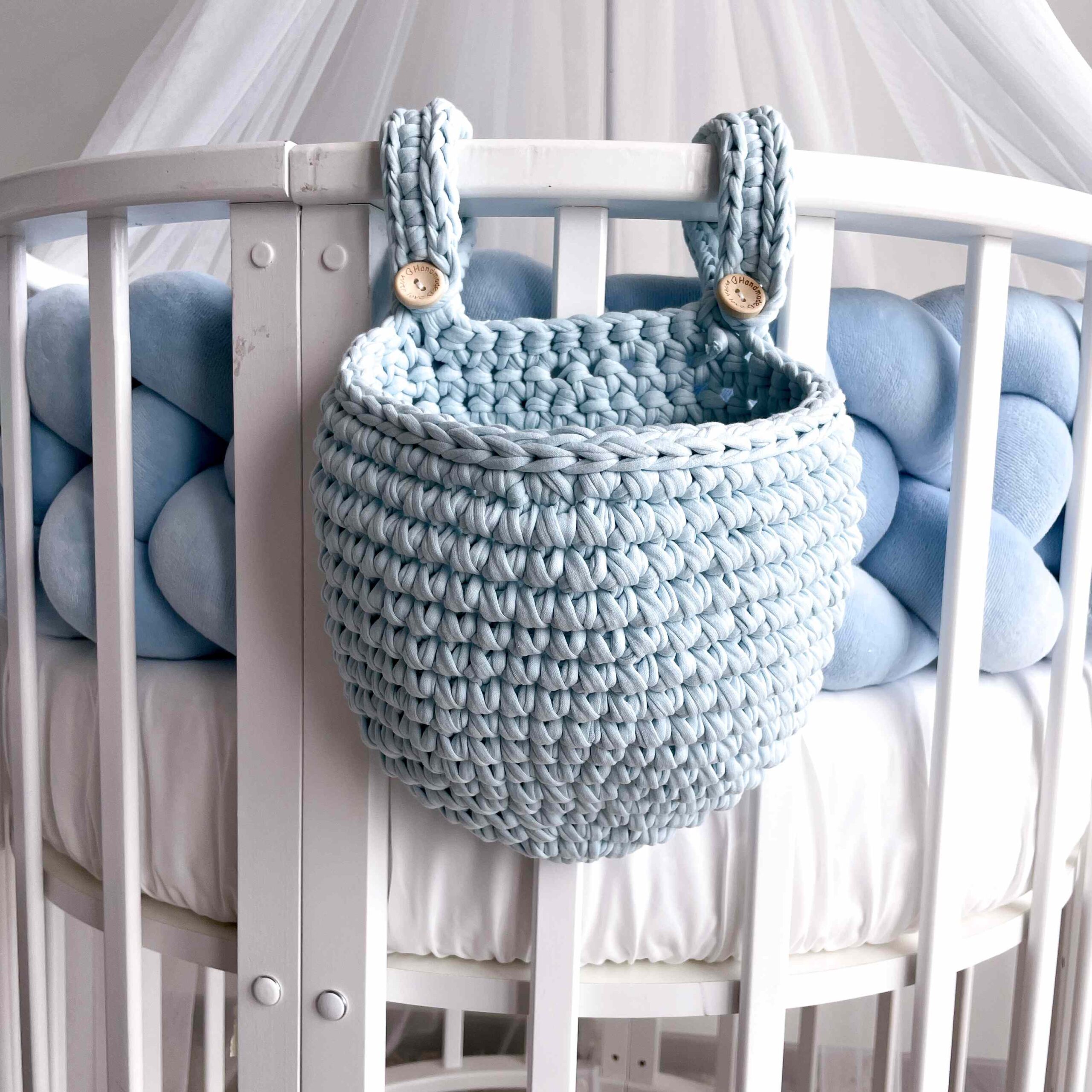 Корзинка крепится к кроватке с помощью удобных петель на пуговицах и идеально подходит для хранения подгузников, сосок, кремов и других важных мелочей. Всё необходимое всегда рядом — без лишних движений и поиска.